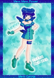 Corina este o fata bogata si este cea mai mare fara a lui renee ea are adn-ul unui delfin albastru.Ea a fost a 2 mew mew si s-a alaturat grupului dupa ce zoey a salvato de monstrul pe care dren la creat din catelusul corinei Name: Corina Bucksworth Japanese Name: Mint Aizawa Transforms Into: Mew Mint Attacks: Ribbon Mint Echo (Japanese version) Animal: Blue Lorikeet cam atat stiu despre ea poze n_n